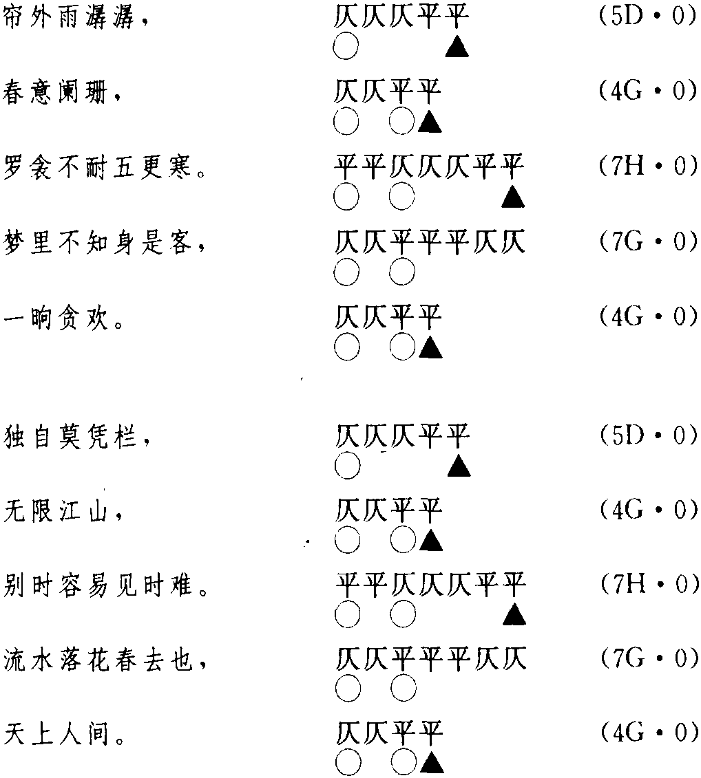 释义 | (6)李煜《浪淘沙令·帘外雨潺潺》 (6)李煜《浪淘沙令·帘外雨潺潺》《浪淘沙令》一词,因白居易词中有“却到帝都重富贵,请君莫忘浪淘沙”而得名。《浪淘沙令》又名《浪涛沙》、《过龙门》、《龙门令》等。单调《浪淘沙令》28字,4句,3平声韵。而双调《浪淘沙》则为54字,2片,前后片各5句,各4平声韵。 这首词,押八个平声韵,详况如下: 潺 读音ch·an(ˊ)。士连切,平,山韵。为an韵目,属an—ian—uan—üan韵部。 珊 读音sh·an(-)。苏干切,平,寒韵。为an韵目,属an—ian—uan—üan韵部。 寒 读音h·an(ˊ)。胡安切,平,寒韵。为an韵目,属an—ian—uan—üan韵部。 欢 读音h·uan(-)。呼官切,平,桓韵。为uan韵目,属an—ian—uan—üan韵部。 栏 读音l·an(ˊ)。落干切,平,寒韵。为an韵目,属an—ian—uan—üan韵部。 山 读音sh·an(-)。师间切,平,山韵。为an韵目,属an—ian—uan—üan韵部。 难 读音n·an (ˊ)。那肝切,平,寒韵。为an韵目,属an—ian—uan—üan韵部。 间 读音j·ian(-)。居闲切,平,山韵。为ian韵目,属an—ian—uan—üan韵部。 在今韵方面,以上八个韵字,所押的韵为an—ian—uan—üan韵部(第210韵部)。 在古韵方面,押寒韵(上平25)、桓韵(上平26)、山韵(上平28)。寒韵与桓韵相邻且通押,而山韵则与以上二韵不通押。 ☚ (5)李煜《捣练子·深院静》 (7)王建《调笑令·团扇》 ☛ |