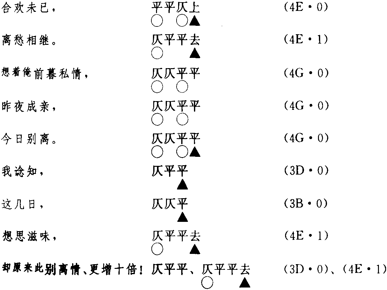 释义 | (6)王实甫《[中吕宫]上小楼·合欢未已》 (6)王实甫《[中吕宫]上小楼·合欢未已》《上小楼》为曲牌名,属中吕宫曲调。正曲的句式为4—4—4—4—4—3—3—4—7; 3平韵,4仄韵(其中3去声韵1上声韵)。么篇略去。这首曲中,有7个衬字。 这首曲,计押七个字韵,详况如下: 已 读音·i (ˇ)。羊已切,上,止韵。为i韵目,属i—ei—ui韵部。 继 读音j·i (ˋ)。古诣切,去,霁韵。为i韵目,属i—ei—ui韵部。 离 读音l·i (ˊ)。吕支切,平,支韵。为i韵目,属i—ei—ui韵部。 知 读音zh·i (-)。陟离切,平,支韵。为i韵目,属i—ei—ui韵部。 日 读音r·i (ˋ)。人质切,入,质韵。为i韵目,属i—ei—ui韵部。 味 读音·ui(ˋ)。无沸切,去,未韵。为ui韵目,属i—ei—ui韵部。 倍 读音b·ei(ˋ)。薄亥切,上,海韵。为ei韵目,属i—ei—ui韵部。 在今韵方面,这七个韵字所押的韵是i—ei—ui韵部(第920韵部)。 在古韵方面,押支韵(上平05)、止韵(上声06)、海韵(上声15)、未韵(去声08)、霁韵(去声12)、质韵(入声05)。 ☚ (5)王实甫《[正宫]小梁州·阁泪汪汪不敢垂》 (7)王实甫《[中吕宫]满庭芳·供食太急》 ☛ |