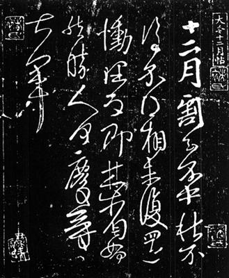 【简介】: 又称《十二月割至帖》。东晋·王献之书。搨本。行草书,凡五行,三十一字。墨迹早佚。原爲宋米芾所藏。刻入《宝晋斋法帖》。此宋搨《宝晋斋法帖》本,上海市图书馆藏。 【赏析】:  历来记载王献之善行草,并创一笔书,唐张怀瓘在《书断》说,其“字之体势,一笔而成,偶有不连,而血脉不断,及其连者,气候通其隔行。”在传爲王献之所书的草书帖中,《十二月帖》最相接近。该帖由行楷起,迅即转爲行草,一气呵成,确如张怀瓘《书估》所说:“非草非行,流便于草,开张于行,草又处其中间”的特色。楷、行、草于晋代虽已具备,然而像《十二月帖》这样流通牵连,气势恢宏而骏逸,一改沉稳内敛的古质之气,不能不说是王献之胆识过人之处,在书史中不愧是一位具有创造性的开拓者。 被乾隆皇帝视作三希堂珍宝之一的《中秋帖》,即爲米芾节临此帖而成。 |