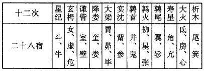 释义 | 十二次 中国古代历术术语。认为岁星(木星)每12年运行1周天,于是自西向东把周天分为12等分,用来表示岁星每年所在的位置,并借以观测日、月、五大行星的位置与运动情形,先沿赤道划分,到唐代时沿黄道划分。其名称为:星纪、玄枵、诹(zōu)訾、降娄、大梁、实沈、鹑(chún)首、鹑火、鹑尾、寿星、大火、析木。十二次与二十四节气相对应,十二节气是各次的起点,十二中气是各次的中点,如星纪的中点相当于冬至点,降娄的中点相当于春分点等,故十二次之名可用来纪月。纪年的十二次与二十八宿相配的关系为: |