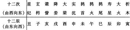 我国古代一种周天划分法。一般认为起源于观测岁星(木星),并据以纪年,后用以观测日月五星位置、说明节气变化。沿黄赤道带自西向东划分十二部分,每部分为一次(“次”为停留意),各次赤经广度起初并不均匀,后按赤道度数等分。十二次与四象大致对应,又各以二十八宿某些星宿作主要标志,依次是:北方玄武:星纪、玄枵(xiāo消)、娵訾(zōuzī邹资),西方白虎:降娄、大梁、实沈,南方朱雀:鹑首、鹑火、鹑尾,东方苍龙:寿参、大火、析木。各次名称由来可参见《尔雅·释天》及注疏。十二次又与二十四节气相对应,以次之起点为节气,次之中点为中气。《汉书·律历志》有具体记载。西方黄道十二宫摩羯、宝瓶、双鱼、白羊、金牛、双子、巨蟹、狮子、室女、天秤、天蝎、人马,隋唐时由印度传入。河北宣化辽墓彩绘星图上绘有黄道十二宫图形,与西方图、名大致相同。