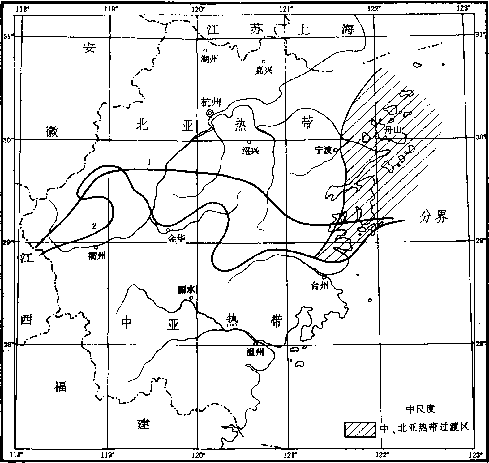 释义 | (二) 热量分区 (二) 热量分区在上述中、北亚热带(或农业气候大区),还存在热量等级和越冬状况的不同,导致农业生产类型的差异,因此需进行热量分区。按照热量分区指标划分,可将浙江境内划分为浙北农业气候大区和浙中南农业气候大区。浙北大区又可分为浙西北温凉冬寒区和浙北温和冬冷区,浙中南大区又可分为浙中南暖温 冬次冷区和浙东南暖热冬温区(图1-2-4)。其意义是: 图1-2-3 浙江省大、中尺度中、北亚热带分界线对比图 注: 1.以海拔200米以下的气象台站网资料绘制的大尺度划分; 2.考虑实际地理影响的中尺度划分。-3℃,所以又适宜喜暖果木如柑桔、文旦、四季柚和黑荆树等的发展,南端局部地区还出现某些南亚热带果木的渗透现象,因此是浙江省热量条伯(含越冬条件)最优越的地区。≥10℃积温5 600℃作为浙中浙南农业气候大区中暖热区和暖温区的分界。其位置在玉环、乐清、永嘉一线以南,青田,文成一线以东; ❷≥10℃积温5 000℃是中迟熟搭配的双季稻三熟制种植的边界,也是亚热带主要经济林木分布的边缘。积温5 000℃分布线与极端最低气温多年平均值-8℃相一致,是油菜等越冬作物易受冻害的界限。≥积温5 000℃作为浙江省浙北农业气候大区中温和区和温凉区的分界线。其位置是北起长兴,经临安和富阳、淳安的西北部,与中、北亚热带分界(5 300℃线)相接。 ☚ (一) 省境内中、北亚热带的划分 六、丘陵山区气候资源特征及其分层 ☛ |