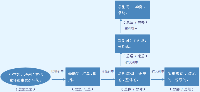 释义 | ![]() ❶ 集中在一起: ~起来说|力量的~和|年终情况汇~。 分 fēn ~流|~家|~头行动。 ❷ 包含全部的;主要的;领导的: ~部|~司令|他被任命为执行~裁|进行全民健身~动员。 分 fēn ~院|~镜头拍摄|这是一家~公司。 总括;汇集。能作带补谓语。一般不带动态助词。 这些数字~起来是很说明问题的|你把两笔账~到一块儿。 全部的;全面的;为首的;领导的。只作定语。 ~店设在本市|~攻击开始了|~的要求是坚决、彻底|~需求|~供给。 ❶一直,一向,表示持续不变。作状语。 他~不听|中秋的月亮,~那么明亮|我早就想跟你详细谈谈,~没时间。 ❷毕竟;总归。常常修饰动词,作状语。 形势~会好转的|一个人~要有一技之长,才能服务于社会|春天~要来临。 ❸有大约、至少的意思,表示推测、估计。多用于数量。常和“大概”连用。作状语。 你到这里工作,~有五六年了吧|这次出差~要十来天时间|我们~有一天还会见面。 【辨】 总和老:都可以作形容词、副词,作副词时,都可以表示持续不变的意思。 区别: ❶意义范围不同。“总”作形容词时,表示全部的、全面的意思,“老”作形容词时,表示年纪大、经历的时间长或经验多的意思;作副词时,“总”还可以表示毕竟、总归、推测的意思,“老”无此义;“老”则还可以表示程度高,如“树长得老高老高的”,“总”无此义。 ❷词性不完全相同。“总”可用作动词,“老”没有动词用法。 【近】 〈副〉❶老 【反】 〈动〉分 〈形〉分 支 【词语】 总裁 总得 总督 总额 总而言之 总纲 总攻 总管 总归 总合 总和 总汇 总机 总集 总计 总角 总结 总括 总揽 总理 总领事 总论 总目 总评 总数 总司令 总算 总体 总统 总务 总则 总账 字源解说 悤,既是声旁也是形旁,表示头脑与心思。总,篆文 ![]() ![]() ![]() ![]() ![]() ![]() 附 文言版《説文解字》:總,聚束也。从糸,悤聲。 附 白话版《说文解字》:总,抓拢丝线并将其束缚起来。字形采用“糸”作边旁,采用“恖”作声旁。 引申线索 ![]() 【字族索引】 总 【同音字】 zǒng |