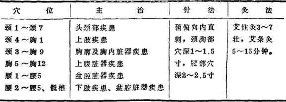 释义 | 华佗夹脊 经外穴名。见承淡安《中国针灸学》。位于第一胸椎至第一骶椎各棘突之间旁开0.5寸处,每侧17穴,左右共34穴。近增第一颈椎至第一胸椎各棘突之间旁开0.5寸处,左右共十四穴,总计48穴,称为夹脊穴。主治及针灸法见表。 华佗夹脊穴表 |