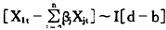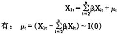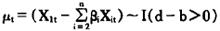 如果有一非平稳随机向量Xt{X1t,X2t,X3t,…,Xnt},且有Xi~I(d)。如果存在某一参数向量 ,使得:  式中,b为正整数;β为协整向量;βi为协整系数。那么,随机向量Xt各元素之间存在协整关系,记为: {X1t,X2t,X3t,…,Xnt}~CI(d,b) 如果有d-b=0,那么有: {X1t,X2t,X3t,…,Xnt}~CI(d,d) 则对于回归方程:  如果β唯一存在,表明非平稳随机向量Xt{X1t,X2t,X3t,…,Xnt}在时间上的实际变动与其长期均衡轨道一致,μt是收敛的,也就是说,即使在某一时点上{X1t,X2t,X3t,…,Xnt}的运动方向相互背离,但它们之间存在的长期规律或天然力量会使它们趋向一致。因而判定{X1t,X2t,X3t,…,Xnt}之间存在长期均衡关系。 如果有d-b>0,那么:  即有d-b>1,μt是发散的,且随时间越来越大。那么X1t与{X2t,X3t,…,Xnt}随时间漂移而去,它们之间不可能存在长期均衡关系式。 因此,寻找一个参数向量 ,使得: {X1t,X2t,X3t,…,Xnt}~CI(d,d) 在协整分析的实践中有意义。 |