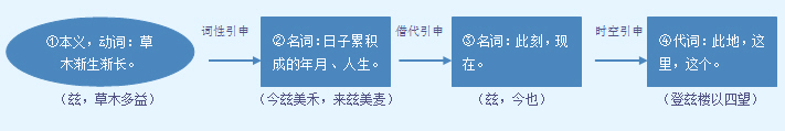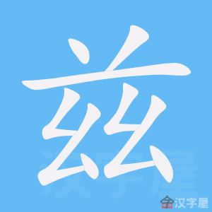 字源解说 丝,既是声旁也是形旁,表示丝线。兹,甲骨文 = (幺,单根蚕丝)+ (幺,单根蚕丝),表示积丝成缕。金文 承续甲骨文字形。篆文 = (艸,草)+ (丝缕),表示草木有如积丝成缕般渐生渐长。有的篆文 误将“艸” 写成似“竹”非“竹”的 。造字本义:草木渐生渐长。隶化后楷书 将篆文字形 中的“艸” 写成 ,将篆文的丝缕 写成 。 附 文言版《説文解字》:茲,艸木多益。从艸,兹省聲。 附 白话版《说文解字》:兹,草木大量增生。字形采用“艸”作边旁,采用省略了草头的“兹”作声旁。 引申线索