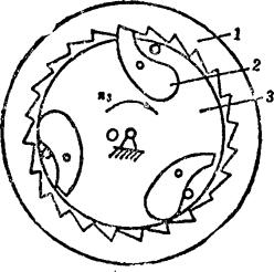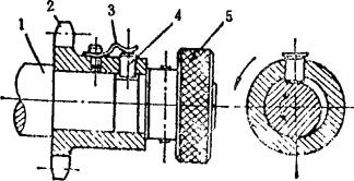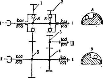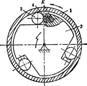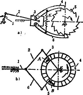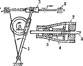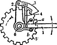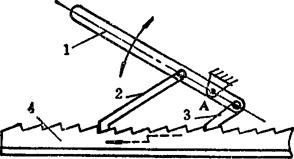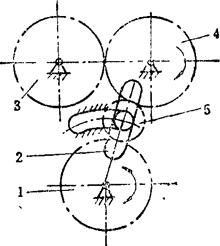 释义 | 单向机构 单向机构,是指从动件在主动件的驱动下作定向移动或定向转动的机构。单向机构中的主动件,是通过一些特殊的联接形式来驱动从动件的。其特点是,当主动件改变方向时,从动件仍按原方向运动或静止不动。 在单向机构中,大部分都具有这样一种特点,即当从动件的转速超过主动件时,主动件就不再起驱动作用。通常称这类单向机构为超越机构。多数单向机构具有超越功能。超越离合器用途甚广。 例5.2-127 爪式无声棘轮单向机构 构件1、2及棘轮5均空套在轴6上,构件2设有柱销a、b。当主动摆杆1顺时针方向转动时,通过销b带著2、3和棘轮5一起转动;当1变向逆时针转动时,通过杆4将棘爪3抬起,与棘轮5脱啮,并通过销a带著2、3无声逆转,棘轮5此时静止不动。综上,棘轮5仅作顺时针方向的转动或者静止不动。 例5.2-128 双动棘轮单向机构 图a)中,主动曲柄1通过连杆2带动滑块3作往复移动。当3左移时,棘爪6带动棘轮5顺时针向转动,而棘爪4在棘轮上滑动;当3右移时,6在棘轮上滑动,而由棘爪4推动棘轮仍按顺时针向转动。其特点是棘轮作单向脉冲式转动。此机构可用在脉冲计算器中作计算装置。图b)为双动端面棘轮单向机构,其原理相同。 例5.2-129 双动棘齿条单向机构 主动摆杆1绕固定支点A作往复摆动。当1向下摆时,使棘爪2推动齿条4左向移动;当1向上摆动时,由棘爪3推动齿条4向同一方向移动。其特点是齿条4作单向脉冲式移动。 例5.2-130 棘爪-棘轮超越式单向机构 主动内棘轮1逆时针向转动时,从动轴3静止不动。1顺时针向转动时,若n1>n3,则通过棘爪2带动从动轴3作同向转动;若n3>n1,则轴3作超越运动。如果轮1固定,轴3只能作顺时针转动,其特点是,轴3作超越转动时,棘爪2在离心力作用下与棘轮脱离接触,可消除噪音。该机构可作为自行车的“飞轮”。 例5.2-131 滚子摩擦棘轮超越式单向机构 主动轮1逆时针向转动时,通过内壁与滚子3的接触摩擦及弹簧K的推力,将滚子挤向所在空间的尖角部位,从而将从动轮2与1楔紧为一体作同向转动;当1顺时针向转动时,摩擦力克服弹簧力并使1、2松开,从动轮2不动;当1、2同时逆时针转动时,如果n2>n1,则1、2也松开,2作超越转动。该机构通常作为无声超越离合器使用。 例5.2-132 柱销超越式单向机构 圆柱销4被弹簧3压紧在从动轴1的特制沟槽内。当主动链轮2顺时针向转动时,从动轴1不转。当轮2逆时针向转动时,通过4带动1同向转动。当1、2同时逆时针向转动,且n1>n2时,则轴1可作超越运动。若1固定,则2的逆时针向转动被制动;若2固定,则1的顺时针向转动被制动。 例5.2-133 弹簧摩擦超越式单向机构 机构中左螺旋弹簧3的内径稍小于轴2的外径,结合面略有预紧压力。弹簧右端与主动轮1上的拨销接触,左端自由。当主动轮1按图示方向转动时,通过拨销1旋紧弹簧,使其内径缩小,结合面压紧力和摩擦力增大,从而带动从动轴2同向转动;当轮1反转时,弹簧内径增大,结合面的压紧力及摩擦力消失,轴2不动。当1、2按图示方向同时转动,且n2>n1时,结合面压紧力消失,2作超越转动。 例5.2-134 齿轮附加离合器单向机构 齿轮1、2和主动轴Ⅰ之间装有方向相反的超越离合器A、B。当主动轴Ⅰ正向转动时,通过离合器A及齿轮1、5带动从动轴Ⅱ转动,离合器B空转;轴1反转时,A空转,通过B及齿轮2、3、4带动从动轴Ⅱ仍按原方向转动。其特点是:不论主动轴Ⅰ是正转还是反转,从动轴Ⅱ总是朝同一个方向转动,但通过不同齿轮的齿数变化改变了轴Ⅰ、Ⅱ的传动比;当主动轴换向时,从动轴的运动稍有停滞。 例5.2-135 齿轮附加惰轮单向机构 主动齿轮1顺时针转动时,经惰轮5驱动从动轮4顺时针转动。当主动轮1换向作逆时针向转动时,惰轮5沿固定曲线槽左移与齿轮3啮合,带动从动轮4仍作顺时针向转动。因此,不管主动轮正转还是反转,从动轮4均按同一个方向转动,即作单向运动。惰轮5由叉杆2支持,其工作位置(是在曲线槽左侧还是右侧)由惰轮轮齿受力的方向自动定位。轮1顺时针向转动时,将轮5推向右侧;轮1逆时针向转动时,轮5被推向左侧。 例5.2-136 金属线送料单向机构 机构中金属线夹头2的内侧中间部呈圆锥状,两端有大小不同的圆柱面可作夹头芯体的导路,用其导引嵌著钢球3及滑块4。滑块4被弹簧压向左边,金属线5由4的中心孔穿过。当输送摆杆1向右摆时,钢球3夹紧金属线5一同向右移动;摆杆1向左摆时,钢球3放松金属线,摆杆仅带动夹头返回,金属线不动。其特点是,间歇式单向输送,空回时有急回特性。 |