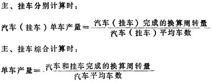 报告期内平均每辆车所完成的换算周转量。不仅按主、挂车分别进行计算,还应对主、挂车进行综合计算。由于报告期的不同,单车产量指标又分单车年产量、单车季产量、单车月产量与单车日产量四种。其计算公式为:  单车产量是反映车辆运输生产效率的综合指标。它综合反映了车辆在时间利用、运行速度、行程利用和载重量利用各方面的情况。要提高单车产量,必须全面改善公路营运业务,改善运输组织工作。单车产量与车辆吨(客)位大小有很大关系,即在各项运用效率指标水平相同的条件下,标记吨(客)位较大的车辆所占比重大时,单车产量就高。反之,则低。 |