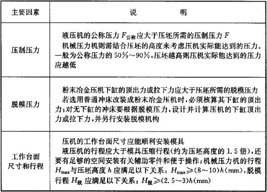 释义 | 压机选择 (一)压机选择的依据 选择压机时一般应考虑的主要因素见表3.3-35。 表3.3-35 压机选择的依据 (二)粉末冶金专用压机的规格 1.转盘式压机(表3.3-36) 表3.3-36 转盘式压机主要技术参数 2.杠杆压机(表3.3-37) 表3.3-37 16t杠杆压机主要技术参数 3.全自动粉末成型机械式压机主要技术参数(表3.3-38) 表3.3-38 粉末成型机械式压机技术参数 4.全自动粉末成型液压机规格及技术参数(表3.3-39) 表3.3-39 全自动液压机的主要技术参数 |