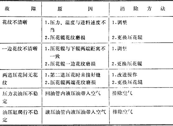 释义 | 压花机 (一)用途 轻革压花纹用。 (二)GJ5F1-35型主要技术规格 压花辊尺寸(直径×长度) Φ120×350毫米 有效压花最大宽度 1175毫米 进料速度 Ⅰ 2.9米/分 Ⅱ 3.8米/分 温度自动调节范围 70~100℃ 皮革通过时所受压力 47~57公斤/厘米2 电热装置(功率/电压) 2千瓦/220伏 油泵型号 YB-25 操作人数 1人 电动机总功率 3.7千瓦 主电动机 2.2千瓦 油泵电动机 1.5千瓦 外形尺寸(长×宽×高) 3000×1700×900毫米 重量 2400公斤 (三)机器特点 1.采用上下辊通过式压花。下辊有两种转速,带动皮革连续通过。 2.压花辊采用电热丝加热,装有自动温度调节仪。 3.下辊采用液压机构升降,由电磁阀控制定位。 4.压花辊防护罩上装有紧急停车装置。 (四)操作与注意事项 1.使用前,检查油箱内油面,各运转部分加注润滑油。 2.接通电源,检查380伏电压(电源电压不能低于340伏)。 3.启动油泵,压力表应在18~22公斤/厘米2。必要时进行调整。 4.油泵电动机运转后,启动主电动机,下辊运转应正常。 5.下辊运转时调速,每档变速应正常。 6.使下辊升降,检查与调整下辊升降速度。 7.压花辊与下辊两端间距应一致。下辊上升至上止点时,压花辊应与下辊相遇。 8.根据产品工艺要求,调整温度计定温针至规定温度范围的上限。接通电源使压花辊加热。 9.待压花辊加热至规定温度,下辊上升至上止点,进行压花。 10.压花时喂皮要铺平,防止摺印。 11.第一道压花后,进行第二道压花要接缝。 12.每张坯革压花后进行检查,防止漏压。 13.操作时要注意压力,温度与进料速度。检查压花辊轴承,防止轴承漏油,沾污革面。 14.遇紧急情况,可推动压花辊防护罩,使下辊下降,并停止运转。 15.工作完毕,拉断开关,切断电源,清洁机器与工作地。 (五)维护与保养 1.经常保持液压油的清洁,切忌杂物掉入油内,定期换油。 2.油管接头要拧紧,防止液压油内带入空气。 3.在10~50℃工作时,液压油冬季为10号机油,夏季为20号机油,酷热季节为30号机油。使用时液压油油温35~60℃。不得超过60℃。 4.定期检查电磁铁,防止灰尘杂物进入而接触不良。 5.机器要严格接地。定期用500兆欧表对电气、电动机及压花辊加热部分进行检查。定期检查防护罩上安全装置。 (六)机器主要故障 表7-26 机器主要故障 |