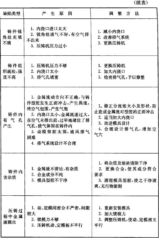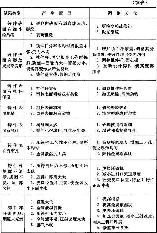 压铸模试模中的缺陷与调整方法见表6.3-2。