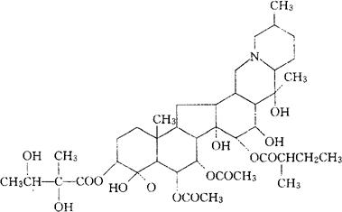 C41H63NO15=809.92 4α,9-环氧瑟瓦烷-3′4,6α,,7α 14,15α,16β,20-辛醇6,7-二醋酸酯3(S)-(2-3-二羟-2-甲基丁酸酯)15(R)-(2-甲基丁酸酯)。 4α,9-Epoxycevane-3′,4,6α,7α 14,15α,16β,20-octol-6,7-diacetate-3(S)-(2,3-dihydroxy-2-methylbutanoate)15(R)-(2-methylbutanoate). 抗高血压药。 Protoveratrine B,Neoprotoveratrine,Veratetrine. USAN,MI.  |