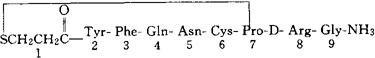 C46H64N14O12S2=1069.24 CAS-16679-58-6 1-(3-巯基丙酸)-8-D-精氨酸-后叶加压素素。 1-(3-Mercaptopropanoic acid)-8-D-arginine-vasopressin. 1-脱氧氨基-8-D-精氨酸后叶加压素。 1-Desamino-8-D-arginine vasopressin. 降血糖药,抗利尿药。 Desmopressin,DDAVP,Adiuretin SD,DAV Ritter,Minirin,Desurin,Minurin. INN,BAN,MI.