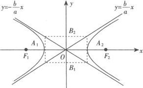 双曲线的标准方程 的几何性质: 1.范围:双曲线在两条直线x=a,x=—a的外侧. 2.对称性:双曲线的图形关于y轴,x轴和原点都是对称的,坐标轴是双曲线的对称轴,原点是双曲线的对称中心,双曲线的对称中心叫做双曲线的中心. 3.顶点:双曲线和它的对称轴的两个交点叫做双曲线的顶点,线段A1A2叫做双曲线的实轴,它的长等于2a,a叫做双曲线的实半轴长,线段B1B2叫做双曲线的虚轴,它的长等于2b,b叫做双曲线的虚半轴长.  4.渐近线:经过A1,A2作y轴的平行线x=±a,经过B2,B1作x轴的平行线y=±b,四条直线围成一个矩形,如上图,矩形的对角线所在直线方程是 ,称为双曲线的渐近线,在双曲线方程 中,如果a=b,此时实轴和虚轴等长,实轴和虚轴等长的双曲线叫等轴双曲线. (5)离心率:双曲线的焦距与实轴长的比 叫做双曲线的离心率,因为c>a,所以双曲线的离心率e>1,双曲线的离心率是反映双曲线的形状中的扁狭和开阔的量,双曲线的离心率越大,它的开口就越开阔. |