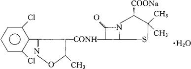 C19H16Cl2N3NaO5S·H2O=510.32 CAS-13412-64-1 CAS-343-55-5(anhydrate) 6-[3-(2,6-二氯苯基)-5-甲基-4-异噁唑甲酰胺基]青霉烷酸钠-水化合物。 6-[3-(2,6-Dichlorophenyl)-5-methyl-4-isoxazolcarboxamido]penicillanate sodium monohydrate. 抗生素类药。用于心内膜炎、败血症、骨髓炎、脑膜炎等。 双氯苯唑青霉素钠,双氯苯甲异噁唑青霉素钠,双氯西林钠。 Dicloxacilline Sodium,Dicloxin. 双氯青霉素钠片。 JAN,JP,USAN,USP,MI.