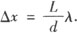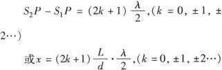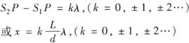 当单色光(或激光)经过双缝后就变成了两个振动情况总是相同的波源(双缝之间的距离d足够小,且远小于双缝到屏幕的距离),当它们分别从双缝到光屏上某点的路程差是波长的整数倍时,两列光波在该点为波峰与波峰叠加、波谷与波谷叠加而出现亮条纹;若到达屏上某点的距离差为半波长的奇数倍时,两列光波在该点一定是波峰与波谷相遇叠加而减弱,因而该点出现暗条纹,如图所示.  出现明条纹的条件为:  出现暗条纹的条件为:  1.屏上明条纹暗条纹之间的距离总是相等的,其距离大小△x与双缝之间距离d,双缝到屏的距离L及光的波长λ有关,即  在L和d不变的情况下,△x和波长λ成正比,应用上式可测光波的波长λ 2.用同一实验装置做干涉实验,红光干涉条纹的间距△x红最大,紫光的干涉条纹间距△x紫最小,则可知:λ红大于λ紫,红光的频率f红小于紫光的频率f紫. 3.若用单色光实验,在屏上得到明暗相间的条纹;若用白光实验,中央条纹是白条纹,两侧是彩色条纹. |
