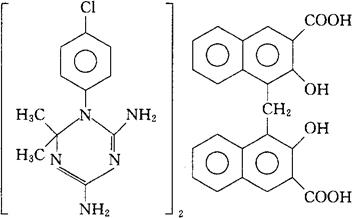 (C11H14ClN5)2·C23H16O6=891.81 CAS-609-78-9 CAS-516-21-2(cycloguanil) 4,4′-亚甲基双(3-羟基-2-萘羧酸)与1-(4-氯苯基)-1,6-二氢-6,6-二甲基-1,3,5-三嗪-2,4-二胺(1∶2)。 4,4′-Methylenebis(3-hydroxy-compd.with 1-(4-chlorophenyl)-1,6-dihydro-6,6-dimethyl-1,3,5-triazine-2,4-diamine(1∶2). 4,6-二氨基-1-(对-氯苯基)-1,2-二氢-2,2-二甲基-均-三嗪与4,4′-亚甲基双(3-羟-2-萘甲酸)。 4,6-Diamino-1-(p-chlorophenyl)-1,2-dihydro-2,2-dimethyl-s-triazine compound(2∶1)with 4,4′-methylenebis(3-hydroxy-2-naphthoic acid). 抗疟药。 思波酸环氯胍。 Cycloguanil Pamoate,CI-501,CN-14,329-23A,PAM-MR-807-23a,NSC-77830,Cycloguanil Embonate,Triazine Pamoate,Camolar. INN & BAN(Cycloguanil Embonate),USAN.  |