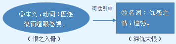仇视;怨恨。心理活动动词。可受程度副词修饰。可带动态助词“过”。常作带宾、带补谓语。 ~敌人|我曾~过他,后来我才知道是我错了|不知为什么,他很~我|~他不成材|大家~得咬牙切齿,发誓要为烈士报仇|~极了|~起来。 悔恨和怨恨的事。 a.作宾语。 这篇文章字里行间似乎有着无限的~。 b.作主语。 满腔的仇和~煎熬着他。 【近】 〈动〉憎 〈名〉仇 怨 【反】 爱 【词语】 恨事 恨铁不成钢