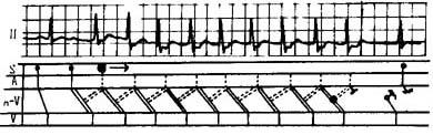 释义 | 反复心律性心动过速 由一系列(连续三个以上)的反复搏动所构成的快速心律称为反复心律性心动过速,简称“反复性心动过速”。 反复心律性心动过速亦称“反复回头性心动过速”或“折返性心动过速”,是阵发性心动过速的一种,其发作起止突然,频率快速,多在120~260次/min。发生原理与反复搏动相同。其特点为适时而提早的心房或心室刺激可使其诱发或终止;不产生二度房室传导阻滞。反复心律性心动过速的折返部位多在房室结和旁道,少数在窦房结和心房。 心电图特征:(1)阵发的第一个心搏,由与反复心律性心动过速同源的反复搏动所引起;(2)一系列快速的室上性QRS波群,每两个QRS波群之间夹有一个逆行P′波;(3)发作终止时最后一个心搏的室上性QRS波群后面,有或无逆行P′波;(4)有时由于频率过速,反复心律性心动过速的QRS-T波可出现时相性室内差异传导或电压交替;(5)反复性心动过速多数由伴有P′-R间期延长的房性早搏所诱发,亦可由伴有R-P′间期延长的连接性早搏诱发,少数可由伴有P-R间期延长的窦性心搏引发,偶有由室性早搏引发时则常伴室房传导阻滞;(6)以往有预激综合征者,当发生反复心律性心动过速时,预激综合征的波形变化情况参见“反复传导”。此外,有人也将反复心律性心动过速称为“阵发性反复性室上性心动过速”。 图示完全性窦性反复心律性心动过速发作的始末。窦性心动过速(第一、二个窦P的P-P时间为0.54s)突然出现一度房室传导阻滞(P-R间期0.35s)而激发窦性反复心律性心动过速,逆P′紧随在室上性QRS波之后,RP′时间短(仅0.07s)。 R-R时间<0.50s,节律基本规则,频率约125次/min。 心动过速中止后有超速抑制致窦性P波延迟在加速的连接性逸搏之后出现,两者在连接区形成干扰性双向性(室房与房室)传导中断。 |