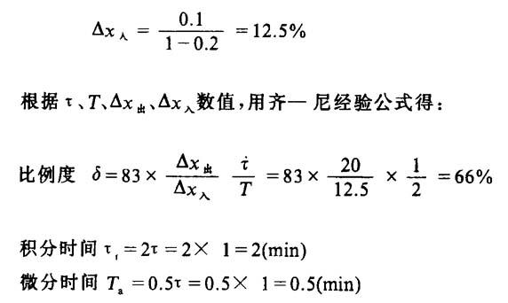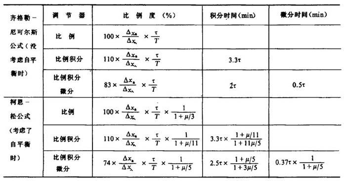 [说明]反应曲线法整定调节器是根据开环曲线进行整定的方法,是用反应曲线来决定调节器参数,它必须求取对象的动态特性,求取过程的反应曲线的步骤是: ❶ 用手动调节旋钮,将被调参数调节到给定值,也就是使调节阀在某一阀压下得到笔直的被测参数的记录曲线; ❷ 突然改变调节阀的开度△xλ(%),这时在被调参数的二次仪表上,得到如下的反应(或记录)曲线(如图4-6-15); ❸ 在反应曲线的“拐点”(上升速度变化的转折点)O点引切线,求出滞后时间x和时间常数T,以及反应曲线上被调参数的变化百分数△x出(%); ❹ 根据经验公式(表4-6-3)即可求得开环整定的调节器的参数。 表4-6-3 开环整定调节器参数的经验公式  [注意]由表2-6-3可看出,在齐格勒—尼可尔斯公式中没有考虑过程的“自平衡”。以带有液体恒速移动的贮槽的液位控制为例:假定贮槽的液位一定,如果当人口流量发生阶跃变化时,那么,贮槽液位将升高,甚至溢流出来,则这种过程就是没有自平衡;反之,如果出口阀门打开并且液体流出速度随著液位升高而增加,那么,贮槽液位将升到一个新的位置,但不是无限地增加,因而该系统是自平衡的。考虑到这种自平衡性,柯恩-松引入了自平衡指数μ:  [例]设有一调节对象,在调节器输出压力急剧变化0.1kg/cm2时的反应曲线如图4-6-14所示,其中τ=1min,T=2min,被调参数变化△x出=20%,如果利用比例、积分、微分三作用调节器,求其整定值。 解:调节阀阀压变化的百分数为:  |