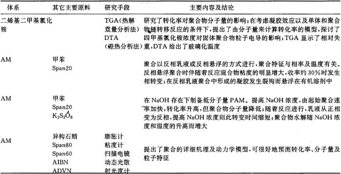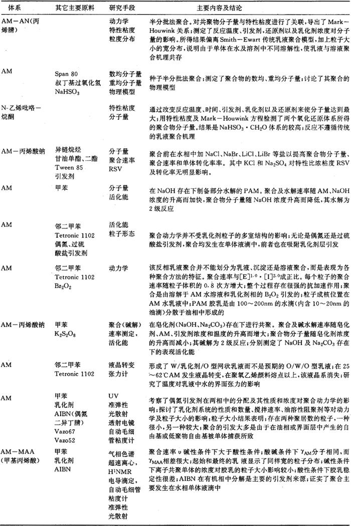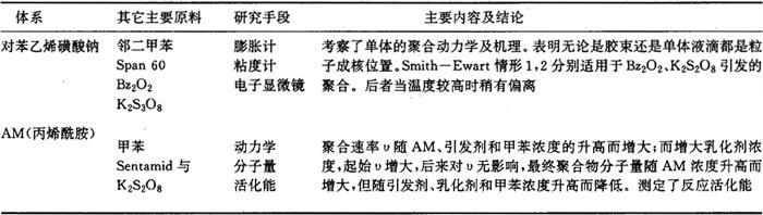 释义 | 反相乳液聚合 乳聚合技术萌生于20世纪早期,30年代见于工业生产。 乳液聚合已成为高分子科学和技术的重要领域,是生产高聚物的重要方法之一。许多高分子材料,如合成塑料、合成纤维、合成橡胶、粘合剂、涂料、絮凝剂、涂饰剂、医用高分子材料以及其它许多特殊用途的合成材料等等,都是采用乳液聚合法生产。 新品种、新方法也不断出现,如微乳液聚合、无皂乳液聚合、辐射乳液聚合、定向乳液聚合以及反相乳液聚合等等。其中,反相乳液聚合是于60年代初期发展起来的一种新型乳液聚合技术,80年代取得了较大进展。 它是将水溶性单体(常溶于水中),借助油包水(W/O)型乳化剂分散于非极性液体中,形成W/O型乳液而进行的聚合。这种聚合可采用油溶性或水溶性的引发剂,若是前者,则体系与常规乳液聚合适成镜式对照,故称之为反相乳液聚合(胡金生等,1987)。 反相乳液聚合对水溶性单体提供了一个可与传统的乳液聚合一样、具有高聚合速率和高产物分子量的聚合方法,还能使水溶性单体有效地聚合成粉状或乳状产物,条件温和,避免了副反应,并有助于应用。其产品正在一些部门发挥著重要作用,如造纸工业、增稠剂、水处理、高吸水性树脂、采油等。 自从1962年J.W.Vanderhoff等首次报道反相乳液聚合的基础性工作以来,国外对这一领域的研究日见活跃。 除大量的应用研究外,基础理论的研究也给予了高度重视。下表中列出了国外有关反相乳液聚合基础性研究的体系、主要原料、研究手段和考察内容等。 表1 国外反相乳液聚合基础研究概况 除表中所列之外,还有关于AM、AM-AA(丙烯酸)、N-乙烯吡咯烷酮-AM纯粹制备的报道。 A.Chem(1991)还介绍了在tabular反应器中进行的AM的反相液聚合。反相乳液聚合的工程研究也已涉及。国外对反相乳液聚合的研究具有如下特点。(1)从聚合体系看,一种单体的均聚占绝大多数,且多采用丙烯酰胺。 二元共聚的研究较少,而三元共聚则未见报道。这可能受基础研究这一内容的局限,因为共聚单体越多,则体系越复杂,难以进行竞聚率、微观结构的测定及反应机理的探讨。(2)采用的溶剂为非极性或极性小的有机溶剂,最常用的有甲苯、邻二甲苯,其它如环已烷、异构石蜡、异链烷烃、煤油等也常被用到。(3)从使用的乳化剂及引发剂看,山梨糖醇酯或聚氧乙烯山梨糖醇酯多用作乳化剂,这是因为它们属非离子型,与有机介质很匹配,有利于乳液的稳定。 特别是山梨糖醇酐的油酸酯等还有利于制超高分子量的聚合物。实验结果还表明,几种乳化剂的共用,或采用共聚乳化剂,对反相乳液的稳定起著很重要的作用。 用到的引发剂包括水溶性和油溶性两类。水溶性引发剂多用过硫酸盐(主要是K2S2O8);而油溶性引发剂则有过氧化物(多为Bz2O2、叔丁基过氧化物)和偶氮类(多见AIBN),其它种类的引发剂如氧化还原引发剂,用的很少。 也有不用引发剂而采用辐射引发的反相乳液聚合的报道。(4)从考察内容看,一般都量研究单体、乳化剂、引发剂的浓度及性质、反应温度等对聚合反应(如动力学、速率等)的影响,以及探讨引发、聚合机理等。 对介质的作用,除皂化剂研究的较多外,其它如在酸、盐存在下的研究较少。 而对产物宏观物理性质及与应用有关的性能研究更少注意。 反相乳液聚合这一特定的聚合方式决定了其产品的应用领域,主要在以下几个方面。 1.造纸工业。 反相乳液聚合产品在造纸工业中主要用作铜网部张添加剂,以提高纸的干强度或染料保留值。Lai、Ta、Wang等开展了这方面的工作。他们将N-乙烯甲酰胺的反相乳液聚合产物,用NaOH溶液水解后,再用浓盐酸酸化。 所得聚乙烯胺·盐酸(分子量≥106)加入纸张中后,其英斯特朗(Instron)张力达9.99×10-2MPa,纸张破裂强度为2.1×10-2MPa,横向扯裂为61.3×10-2MPa。 而含有聚乙烯醇(分子量6.0×105)的纸张,上述参数分别为8.6×10-2、1.3×10-2和5.5×10-2,同时聚乙烯胺还可提高TiO2的保留值。 2.水处理。 丙烯酰胺均聚物或与其它单体的共聚物常用于水处理,且大多数作絮凝剂用。如Kojima、Kazutaka用Bz2O2引发AM反相乳液聚合,得到的产品(含水80%)用作絮凝剂,可很容易地通过喷雾方式进行。反应过程中沉积的聚合物非常少。Ringer、Engen等也对AM的反相乳液聚合进行了研究。 他们除采用AIBN作引发剂外,还利用ZnSO4·7H2O作促进剂,最后得到了稳定的PAM精细分散体,作絮凝剂用。若无ZnSO4·7H2O,则聚合反应很快,并大量放热,使产品报废。 丙烯酰胺的共聚物絮凝剂研究较多的是AM-AA。由于丙烯酸(AA)的引入,使该类共聚物絮凝剂又兼具增稠性能。聚乙烯胺·盐酸亦可用于水处理。另外,Yang、Henry等通过反相乳液聚合过程制得含疏水胶体聚合物,用于水中污染物(特别是油)的清除。他们采用水溶而油不溶的共溶剂(如甲醇、丙醇)和一热处理技术,来将水不溶性单体溶于水溶性单体中,并加入新型共乳化剂使之稳定。所得产物为AM-3(甲基丙烯酰胺基)丙基氯化铵-辛基丙烯酰胺共聚物。 3.增稠剂。增稠剂也是反相乳液聚合应用得较多的领域。反相乳液合聚合法生产的增稠剂已广泛用于印染工业,其产品性能很好。 国外80年代的优秀产品、英国Allied Colloid公司的Alcoprint PTF便是采用该法生产。 4.吸水聚合物。Nagasuna、Kinya等用0.005~20mol%的可聚合单体(AA、丙烯酸钠、亚甲基双丙烯酰胺),浸渍水溶性载体聚合物粒子(仍由上述单体制得),