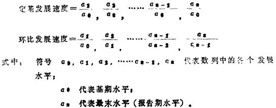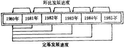 根据两个不同时期指标水平的对比而求得的动态分析指标。通常用百分数表示,有时也用倍数表示。 由于对比时所采用的基期不同,发展速度又可分为环比发展速度和定基发展速度两种。前者为报告期水平与前一期水平之比,反映现象的逐期相对变动程度;后者为报告期水平与固定基期水平之比,反映现象在较长的时期内总变动的程度,有时也叫发展总速度。两者区别示意如下:  它们的计算公式为:  环比发展速度与定基发展速度之间有著换算关系,即环比发展速度的连乘积等于相应时期的定基发展速度。利用这种换算关系,可进行两指标间的推算与验证。其具体关系式如下: