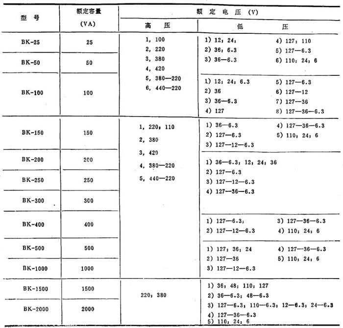 电力变压器采用R10容量系列,有SL1型三相油浸铝线电力变压器、SFL1型三相油浸风冷铝线电力变压器、SFPL1型三相强油冷风冷电力变压器、SFPSL1型三相风冷三线圈铝线电力变压器、SWPO型三相强油水冷自耦电力变压器、SFS7型三相油浸风冷三线圈低损耗电力变压器、S7型三相油浸低损耗电力变压器、S9型三相低损耗电力变压器等。其中,S7、S9是中小型电力变压器的新型系列。SL7系列低损耗电力变压器的型号及技术参数见表8.2-27。 表8.2-27 SL7系列低损耗电力变压器  BK系列控制变压器为小型干式变压器,常用于电气控制系统的电源部分,或作为照明、指示灯的电源。BK系列控制变压器做成单相多绕组开启式,高、低压绕组分开绕制,每一容量输入与输出电压有多种配置,可根据需要选择。BK系列控制变压器主要型号及技术参数见表8.2-28。 表8.2-28 BK系列控制变压器  |