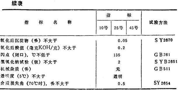 释义 | 变压器油 本产品是由石油润滑油馏分经脱蜡、酸碱洗涤或白土精制所制得的适于变压器及油开关绝缘用的变压器油。 表1-117 变压器油质量标准(SY1351-76) 注: ❷ 保证出厂耐电压35千伏以上,在用户使用前必须进行过滤并重测耐电压。 ❸ 测定透明度,需用直径30~40毫米的试管盛装,冷却到+5℃时应保持透明。 ❹ 用于气温不低于-15℃地区的变压器油,凝点-10℃许可出厂。 |
