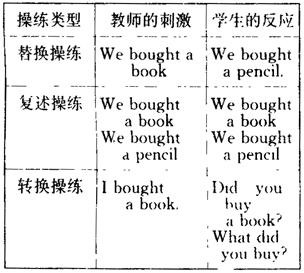 释义 | 句型操练 也叫“结构操练”、“替换操练”。在语言教学中为练习某种句子结构采用填充法和替换框架而进行的训练。这种训练要求学生根据类推的原理模仿一种结构或把一种结构变成另一种结构。句型操练一般由两部分组成:⑴老师给一个词或一个句子作为刺激;⑵学生根据复述、替换式转换等要求作出各种反应。如: |