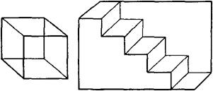 释义 | 可逆图形 特殊知觉刺激。 可在两个或两个以上的知觉组织之间“自发”切换的刺激模式。著名的有内克尔的立方体和施罗德的可逆楼梯(见下图)。在观察某个可逆图形时,个体会看到两个图形在不断地交替转换。在一般情况下交替转换的速度与图形的特殊性质有关。 注视可逆图形的时间越长,交替变换的速度越快。在一定程度上,可逆图形的转换可以由知觉者有意识地控制。 如在观察内克尔立方体时,注视该图某些特定的点,有助于稳定地看到一个图形。 |