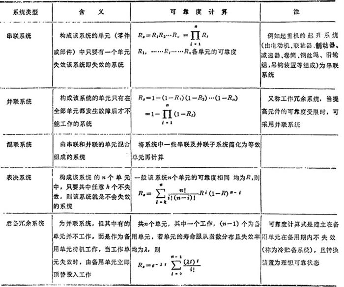 释义 | 可靠性预测 预测可以协调设计参数与指标,对比设计方案,发现薄弱环节。 元件的失效率或可靠度可从可靠性数据库获得,也可通过可靠性试验求得。各零部件经过可靠性预测后,即可进行系统的可靠性预测。预测方法有多种〔23、24〕,其数学模型法列于表3.3-8。 表3.3-8 系统可靠性计算表 |