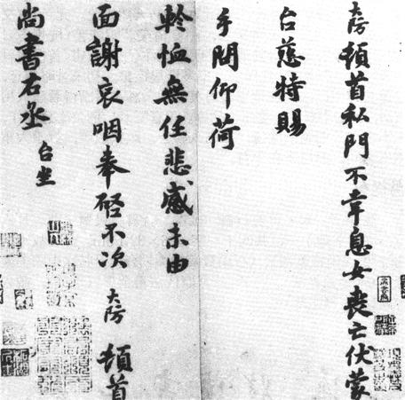 【简介】: 宋·吕大防书。纸本。楷书。尺牍一则。凡六行,每行字数不一,共四十八字。28.8×28.7cm。台北故宫博物院藏。《书画滙考》、《墨缘滙观》、《石渠宝笈续编》著录。刊于台湾《故宫历代法书全集》(十二)。载入台湾《故宫书画录》卷三。 【赏析】: 这件书法作品,像作者一样,放在整个书法史的长河中是极其普通之作。于是,欣赏这类旣非名家,更非大家的作品就要以别样的标凖去审视,发掘其应有的价値,否则难免偏见。的确,我们若以此作与苏、黄、米、蔡相比,也许是无甚妙处。然而衡量这种本非名家的作品,纵使“一得”也就足以让我们受益了。 其实,这件作品在技巧上所体现出来的高度与深度是极爲明显的。所谓高,是指用笔上的精熟;所谓深,是指其结字上对空间平衡规律上的把握。 自唐代立法以来,在结字与用笔上都已形成了一种相对恒定的模式。而颜眞卿的风格则是其中的一种。这件作品,也是在很大程度上接受了颜眞卿的模式。它的结字多呈宽博、雍容之势。每一点画的起落、提按、顿挫都极爲果断和凖确,线质也饱满遒劲。能达到这一点,或许是因爲胎息于对《多宝塔碑》的用功吧。  宽博之势的获得,源于字形外边、角的用笔与线条的严谨与强调。每字的第一笔与最末一笔,每字四围最靠边的线条都强调得极爲严谨淸晰。这样处理的结果与目的就使得四围的气息特别严密,从而将空间固定在有限的範围裏以完成单个字的自足。仅此一点,就已是我们今天所最爲缺乏的了。 |