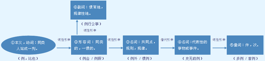 例,篆文=(人)+(列,并排成队),造字本义:同一类型的人站成一列。