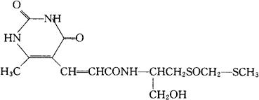 释义 | 司帕霉素 C13H19N3O5S2=361.43 CAS-1404-64-4 [S-(E)]-N-[1-(羟甲基)-2-[[(甲硫基)甲基]亚磺酰]乙基]-3-(1,2,3,4-四氢-6-甲基-2,4-二氧代-5-嘧啶基-2-丙烯酰胺。 N-[1-(Hydroxymethyl)-2-[[(methylthio)methyl]sulfinyl]ethyl]-3-(1,2,3,4-tetrahydro-6-methyl-2,4-dioxo-5-pyrimidinyl)-2-propenamide-,[S-(E)]-. 抗肿瘤药。 司帕索霉素。 Sparsomycin. INN,NFN,USAN. |