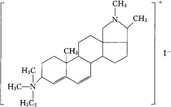释义 | 司库碘铵 C26H43IN2=510.54 CAS-30033-10-4 (康纳-4,6-二烯-3β-基)二甲基乙基铵碘化物。 (Cona-4,6-dienin-3β-yl)dimethylethylammonium iodide. N-乙基-N,N-二甲基康纳-4,6-二烯-3铵碘化物。 N-Ethyl-N,N-dimethylcona-4,6-dien-3-aminium iodide. 神经肌肉阻断药。 Stercuronium Iodide,MYC 1080. INN,USAN. |