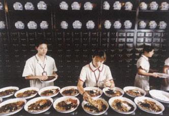 北京同仁堂是中国传统医药中闻名遐迩的老字号,始建于1669年,至今已有337年历史。 同仁堂从1723年开始“承办官药”直至1911年,在长达188年时间里,同仁堂遵照皇家挑选药材标准,恪守皇宫秘方和制药方法,形成一套严格的质量监督制度,同仁堂与清宫太医院、御药房之间有机的融合和影响,形成了同仁堂中药的特殊风格和传统知识。 同仁堂经营的中草药和丸、散、膏、丹等各种中成药,以选料真实、炮制讲究、药味齐全著称于世。以牛黄清心丸、大活络丹、乌鸡白凤丸、安宫牛黄丸等为代表的十大王牌一直在市场上供不应求。 同仁堂中医药文化集中体现在“同修仁德,济世养生”的价值观,“炮炙虽繁必不敢省人工,品味虽贵必不敢减物力”的质量观和“讲信义,重人和”的经营理念,“童叟无欺,一视同仁”的职业道德,以及同仁堂的品牌和特有标记,《乐氏世代祖传丸散膏丹下料配方》和《同仁堂虔修诸门应症丸散膏丹总目》,同仁堂传统中药炮制技术,同仁堂的制药特色即传统中医药与宫廷制药的融合,概括为“处方独特、选料上乘、工艺精湛、疗效显著”。 同仁堂商标已参加了马德里协约国和巴黎公约国的注册,受到国际组织的保护。  配制中药 |