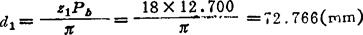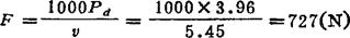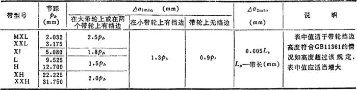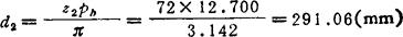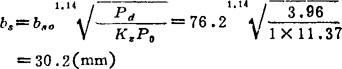 释义 | 同步带传动的设计计算 同步带传动的最主要参数是节距pb。它是在规定的张紧力下,同步带纵截面上相邻两齿对称中心线的距离,如图4.14-6所示。在同步带中保持原长度不变的周线称为节线,节线长Lp为公称长度。同步带有单面齿和双面齿两种,简称单面带和双面带。双面带按齿排列的不同,有DA型(对称齿型)和DB型(交差齿型),如图4.14-7所示。标准同步带有7种型号,其齿形尺寸见表4.14-21,节线长度系列及其极限偏差见表4.14-22,带宽系列见表4.14-23,同步带传动的设计计算见表4.14-24,有关参数分别见表4.14-25~4.14-28。图4.14-8所示为同步带选型图线。 表4.14-21 标准同步带的齿形尺寸(摘自GB11616-89) mm 同步带轮一般采用渐开线齿形,由渐开线齿形带轮刀具用范成法加工而成。齿条刀具的尺寸和公差见表4.14-29。也可以使用直边齿形,直边齿带轮的尺寸和公差见表4.14-30。标准同步带轮的直径见表4.14-31,带轮宽度见表4.14-32。同步带在运转时,有轻度的侧向推力。为防止带脱落的挡圈尺寸见表4.14-33。带轮的公差和表面粗糙度见表4.14-34,同步带传动的轴间距公差见表4.14-35。 表4.14-29 渐开线齿形带轮加工刀具一齿条刀具的尺寸和公差(摘自GB11361-89) 注:GB11361-89规定了带轮间的允许偏斜角△θ,带宽bs≤25.4mm时,tg△θ≤6/1000;bR=38.1~50.8mm时,tg△θ≤4.5/1000;bs≥76.2mm时,tg△θ≤3/1000。 例4.14-2 设计一液体搅拌机的同步带传动。该设备由额定功率为2.2kW、转速n1=1430r/min的鼠笼式电动机驱动。搅拌机转速n2=430r/min,中心距a0为500mm左右,带轮直径不受限制,每日三班制工作。 设计计算的方法和步骤如下: 功率计算:由表4.14-25查得K0=1.8,于是Pb=K0·P=1.8×2.2=3.96(kW) 选择带型、节距Pb:根据Pd和n1由图4.14-8选得带的节距代号为H,对应的节距Pb=12.700mm。 小带轮齿数z1:由表4.14-28查得小带轮最小齿数z1min=18。取小带轮齿数z1=18。 小带轮节圆直径: 大带轮齿数 取标准带轮齿数z2=72(见表4.14-31)。 大带轮节圆直径: 带速: 初定中心距a0:根据机器结构要求: 0.7(d1+d2)≤a0≤2(d1+d2) 则0.7(d1+d2)=0.7×(72.766+291.06) =254.678 2(d1+d2)=2×(72.766+291.06)=727.652 取a0=500(mm) 带长L0及其齿数Z: 实际中心距(轴间距可调): 小带轮啮合齿数: 基本额定功率:由表4.14-26查得H型基准宽度b30=76.2mm,由表4.14-27查得基准宽度bs0的带的许用工作拉力T0=2100N,由表4.14-27查得带的单位长度的质量m=0.448kg/m,于是, 带宽:因zm>6,取Kz=1,于是 作用在轴上的力: 选用同步带630H150。其余从略。 |