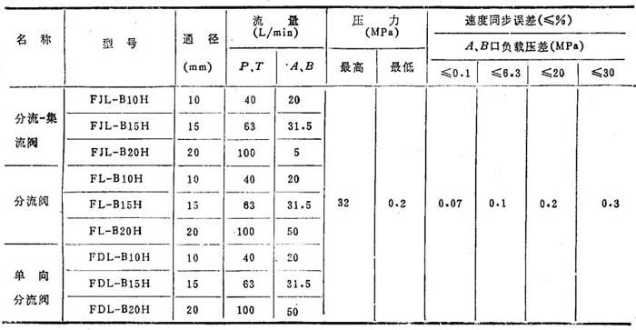 在两个液压执行机构共同带动同一工作机构时,要求两液压缸运动同步,其方法有多种,采用同步阀是其中的一种。 同步阀可根据负载的不同,阀芯能自动调节所处的位置,使流过阀的两股油流的流量相同。按同步阀的工作原理,可分为:分流阀,即进入阀为一股油流,阀能输出流量相同的两股油流;集流阀,即输入阀的是流量相同的两股油流,输出为一股油流。具有上述两种功能的阀叫分流-集流阀。若按产品分,则有:分流式同步阀,即可按固定比例将一股油流分为两股支流,使执行元件在一个方向上达到速度同步;单向分流式同步阀,其功能和分流阀相同,油流反向流动时可经单向阀流出,因而可减小经过阀的压力损失;分流—集流式同步阀,即可按固定比例自动分配或集中两股油流,使执行元件双向均能速度同步。常用同步阀的技术参数见表7.6-26,其型号的意义如下:  ❶ 名称:FJL为分流—集流阀;FL为分流阀:FDL为单向分流阀 ❷ 板式连接代号为B❸ 通径:mm❹ 压力:32MPa 表7.6-26 同步阀技术参数  注; ❶ 表中P为进油口;T为回油口;A、B为通往执行机构的油口。 |