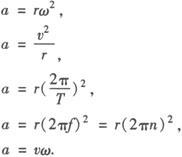 1.定义:由向心力产生的加速度. 2.向心加速度a与向心力F的关系遵从牛顿第二定律F=ma. 3.方向:总是沿半径指向圆心,始终与线速度方向垂直. 4.大小(由向心力公式和牛顿第二定律求得):  5.意义:描述由于运动方向改变而引起的速度变化的快慢. 6.匀速圆周运动是加速度变化的变加速曲线运动(非匀变速曲线运动),因为对某一确定的匀速圆周运动来说,m、r、v、ω、T的大小都是不变的,所以向心力和向心加速度的大小不变,但方向却时刻改变. 7.对于变速率圆周运动,可以用公式求质点在圆周上某点的向心加速度瞬时值,其中v或ω应取该点的线速度和角速度的瞬时值. |