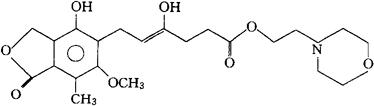 C23H31NO7=433.50 CAS-115007-34-6 己烯酸,6-(1,3-二氢-4-羟-6-甲氧-7-甲基-3-氧代-5-异苯并呋喃基)-4-甲基-,2-(4-吗啉基)-乙酯,(E)-。 Hexenoic acid,6-(1,3-dihydro-4-hydroxy-6-methoxyl-7-methyl-3-oxo-5-isobenzofuranyl)-4-methyl-,2-(4-morpholinyl)ethyl ester,(E)-. 2-吗啉代乙基(E)-6-(4-羟基-6-甲氧基-7-甲基-3-氧代-5-邻苯二甲基)-4-甲基-4-己烯酸酯。 2-Morpholinoethyl(E)-6-(4-hydroxy-6-methoxy-7-methyl-3-oxo-5-phthalanyl)-4-methyl-4-hexen-oate. 免疫调节药。 Mycophenolate Mofetil,RS-61443. USAN.  |