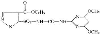 又称草克星。 磺酰脲类选择性内吸除草剂。化学名称:5-〔3-(4,6-二甲氧基嘧啶2-基)脲基磺酰基〕-1-甲基吡唑-4-羧酸乙酯。 化学结构式如下。  原药为白色结晶,熔点181~182℃,微溶于甲醇、乙酸乙酯及苯等有机溶剂;在水中溶解度随pH值变化而变化,pH4.6时溶8.5mg/L,pH6时溶22mg/L,pH7时溶1494mg/L。 能被植物的根、幼芽、茎、叶吸收,并在体内传导到各部分,抑制植物体内氨基酸、赖氨酸、异亮氨酸的生物合成,阻止细胞的分裂和生长,导致敏感植物幼芽生长受抑制,根系发育停滞坏死。有效成分进入水稻体内迅速被代谢成无害的化合物。 用于水稻直播田、秧田及移栽田防治多种阔叶杂草及莎草科杂草,如泽泻、异型莎草、水莎草、鸭舌草、水芹、节节菜、瓜皮草、眼子菜、青萍、紫萍等,对稗草有一定抑制作用。直播田、秧田在水稻1~3叶期施药;水稻移栽田移栽后3~15天施药,用量有效成分15~30g/hm2。 对大鼠急性口服LD50为5000mg/kg,急性经皮LD50>20000mg/kg,对鱼低毒,鲤鱼TLM(48h)>10mg/L。 |