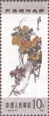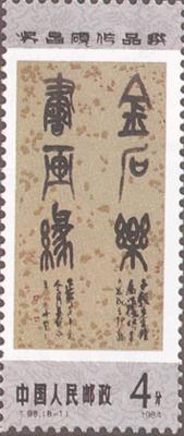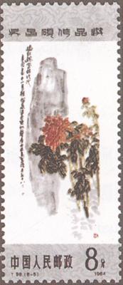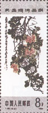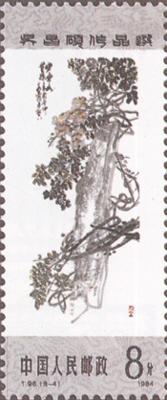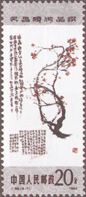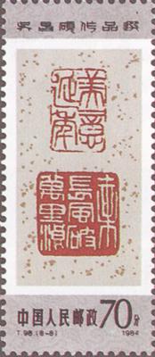 发行日期:1984年8月27日 齿孔度数: 印刷版别:影写版 票幅:25×60 全张枚数:40(10×4) 原画作者:吴昌硕 设计者:卢天骄 印刷:北京邮票厂         (1)4分 书法 750.66万枚 (2)4分 双桃 820.46万枚 (3)8分 芙蓉 1156.86万枚 (4)8分 紫藤 1205.26万枚 (5)8分 牡丹 1096.86万枚 (6)10分 秋菊 956.86万枚 (7)20分 梅花 939.66万枚 (8)70分 篆刻 644.26万枚 (1)-(8) 8枚全 |