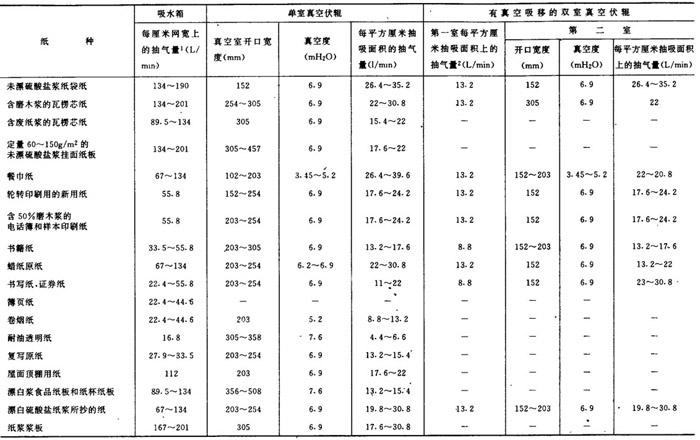 1.计算法 【公式】  式中 V——吸水箱真空系统的总抽气量(L/min) ——成形网宽(m) Vm——造纸机最大工作车速(m/min) K——在吸水箱上以每平方米网面上抽吸的平均空气量(L/m2),可按表1-15-12选取 表1-15-12 按单位成形网通过面积计的吸水箱平均抽吸空气量(L/m2)  2.查表法 【说明】 长网纸机吸水箱及真空伏辊所需的抽气量的计算可根据车速查表,得到每厘米网宽上的抽气量,之后即可按公式计算。见表1-15-13。 表1-15-13 长网造纸机网部普通吸水箱和真空伏辊的需用抽气量  注1、真空度3.45mH20 2、真空度3.45mH20箱口宽度100~150mm 3、lmH20=9806.65Pa 【公式】  式中 V——吸水箱(或真空伏辊)在一定真空度下的抽气量(m3/min) Q——每厘米网宽上的抽气量[L/(min·cm)],见表1-15-13 Bw——网宽(mm) 【例】 某纸机生产印刷纸,车速为300m/min,网宽为4700mm,求该纸机吸水箱在33832Pa(3.45mH2O)真空度下的抽气量。 解:按表1-15-13查得吸水箱抽气量为33.5~55.8L/(min·cm),因300m/min的车速对书籍纸是属于中速范围,故抽气量数据可取表中范围的平均值,即44.65L/(min·cm),于是,该纸机网部吸水箱在33832Pa真空度下的抽气量为:  |