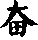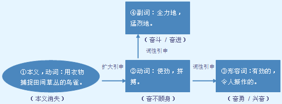 字源解说 奮,金文 = (衣,服装)+ (隹,鸟雀)+ (田,田野),表示用衣服捕捉田间草丛的鸟雀。远古时代天人无界,鸟雀多且不惧人类,所以容易徒手捕捉。造字本义:农夫用衣物全力捕捉田野草丛中的鸟雀。诅楚文 变形,“衣”形模糊。篆文 进一步变形,“衣”形彻底消失。俗体楷书 省去了正体楷书 的“隹”,大大简化了字形,也失去了本义的线索。 附 文言版《説文解字》:奮,翬也。从奞在田上。《詩》曰:“不能奮飛。” 附 白话版《说文解字》:奋,鸟振翅高飞。字形采用“奞、田”会义,像大鸟从田间起飞。 引申线索