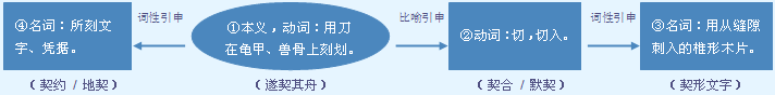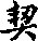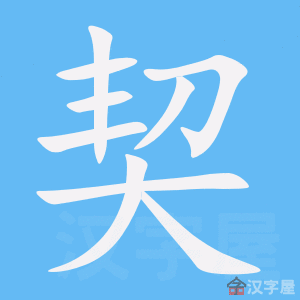 字源解说 “ ”是“契”的本字。 ,甲骨文 = (像纵横交错的刻纹)+ (刀,刻刀),表示用刀刮刻。篆文 承续甲骨文字形。篆文异体字 加“大” (成年人),强调“契”为成年人的行为。造字本义:古人用刀具在龟甲、兽骨上刻划记号、标志。隶化后楷书 将篆文字形中的 写成 ,将篆文字形中的 写成 。 附 文言版《説文解字》:契,大約也。从大从 。《易》曰:“後代聖人易之以書契。” 附 白话版《说文解字》:契,正式的协约文件。字形采用“大、 ”会义。《易经》上说:“后代的圣人用书契替代它。” 引申线索