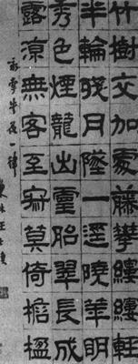 释义 | 咏牵牛花诗轴 【简介】: 淸·汪士愼书。纸本。隷书。凡四行,另行书题款两行,共五十一字。98×37cm。上海博物馆藏。刊于日本《中国明淸书法名品图册》。 【赏析】: 是幅分书用笔纯以汉法爲之。藏锋逆入,中锋铺毫,笔画横平竪直,有粗细变化,运笔洒脱。章法因界格所囿,布白横紧竪疏,字形大小划一,整齐端庄。结体长方略取纵势,从《北海相景君铭》化来,但比《景君铭》方整端秀。爲淸际隷书端庄一派的代表作。何绍基隷书书风结体与此相似,当受其影响。 |
