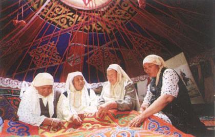 释义 | 哈萨克族 人口为1250458人。 哈萨克族主要分布于新疆维吾尔自治区伊犁哈萨克自治州、木垒哈萨克自治县和巴里坤哈萨克自治县;少数分布于甘肃省阿克赛哈萨克自治县和青海省海西蒙古族哈萨克族自治州。2000年第五次全国人口普查公布,哈萨克族人口数为1250458人。其中绝大多数集中在新疆维吾尔自治区,使用哈萨克语,属于阿尔泰语系突厥语族克普恰克语支。 哈萨克先民曾使用过鄂尔浑——叶尼塞文、回鹘文。 伊斯兰教传入后,1959年又设计了以拉丁字母为基础的新文字方案,但推广条件不成熟,1982年恢复使用原有文字,将新文字作为音标保留。 1949年后,国家在哈萨克族地区大力发展工业,著名的克拉玛依油田和独山子油田、伊犁榨油厂、布尔津面粉厂、塔城和阿勒泰的面粉厂、阿勒泰的水电厂等,都是由国家投资在短期内建成的。 第二条欧亚大陆桥在伊犁哈萨克自治州阿拉山口出境。 主要节日有古尔邦节和肉孜节;还有“诺鲁孜”节,时间在农历正月。 过节的那一天,互相祝贺,有如汉族的春节,是送旧迎新的节日。每逢节日喜庆时都举行传统的叼羊、赛马和姑娘追等游戏。哈萨克族大多信仰伊斯兰教,有些牧民仍保留著萨满教的残余。 哈萨克族老妈妈正在制作花毡 |