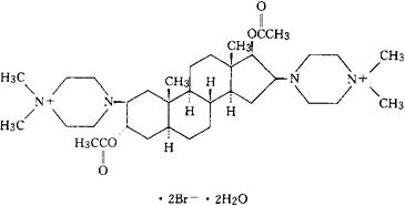 C35H62Br2N4O4·2H2O=798.74 CAS-68399-57-5 CAS-52212-02-9(anhydrous) 4,4′-[(2β,3α,5α,16β,17β)-3,17-双(乙酰氧)雄甾烷-2,16-二基]双[1,1-二甲基哌嗪鎓]二溴化物,二水化物。 4,4′-[(2β,3α,5α,16β,17β)-3,17-bis(Acetyloxy)androstane-2,16-diyl]bis[1,1-dimethylpiperazinium]dibromide,dihydrate. 4,4′(3α,17β-二羟-5α-雄甾烷-2β,-16β-亚基)双[1,1-二甲基哌嗪鎓]二溴化物,二醋酸(酯),二水化物。 4,4′-[(3α,17β-Dihydroxy-5α-androstan-2β,16β-ylene)bis[1,1-dimethylpiperazinium]dibromide,diacetate(ester),dihydrate. 神经肌内阻断药,肌肉松弛药。 哌可松。 Pipecuronium Bronide,RGH 1106. INN,BAN,USAN.