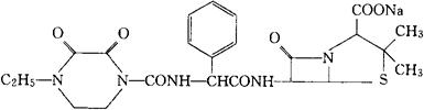 C23H26N5NaO7S=539.54 CAS-59703-84-3 (2S,5R,6R)-6-[(R)-2-(4-乙基-2,3-二氧代-1-哌嗪甲酰胺基)-2-苯乙酰胺基]-3,3-二甲基-7-氧代-4-硫杂-1-氮杂双环[3.2.0]庚烷-2-羧酸钠。 Sodium(2S,5R,6R)-6-[(R)-2-(4-ethyl-2,3-dioxo1-piperazine carboxamido)-2-phenylacetamido]-3,3-dimethyl-7-oxo-4-thia-1-azabicyclo[3.2.0]heptane2-carboxylate. 抗生素类药。用于绿脓杆菌、大肠杆菌、肺炎球菌引起的感染。 氧哌嗪青霉素钠。 Piperacillin Sodium,Pipracil,T-1220. 注射用氧哌嗪青霉素钠(注射用哌拉西林纳)。 INN,BAN,DCF,DCIT,JAN,USAN,USP,MI.