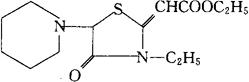 C14H22N2O3S=298.40 CAS-17243-64-0 [3-乙基-4-氧代-5-(1-哌啶基)-2-噻唑烷亚基]乙酸乙酯。 [3-Ethyl-4-oxo-5-(1-piperidinyl)-2-thiazolidinylidene]acetic acid,ethyl ester. 3-乙基-4-氧代-5-哌啶基△2,α-噻唑烷乙酸乙酯。 Ethyl3-ethyl-4-oxo-5-piperidino-△2,α-thiazolidineacetate. 利胆药。 Piprozolin,W 3699,Go 919,Biliserve,Coleflux,Epsyl,Eubilin,Probilin,Secrebit. INN,USAN.  |
